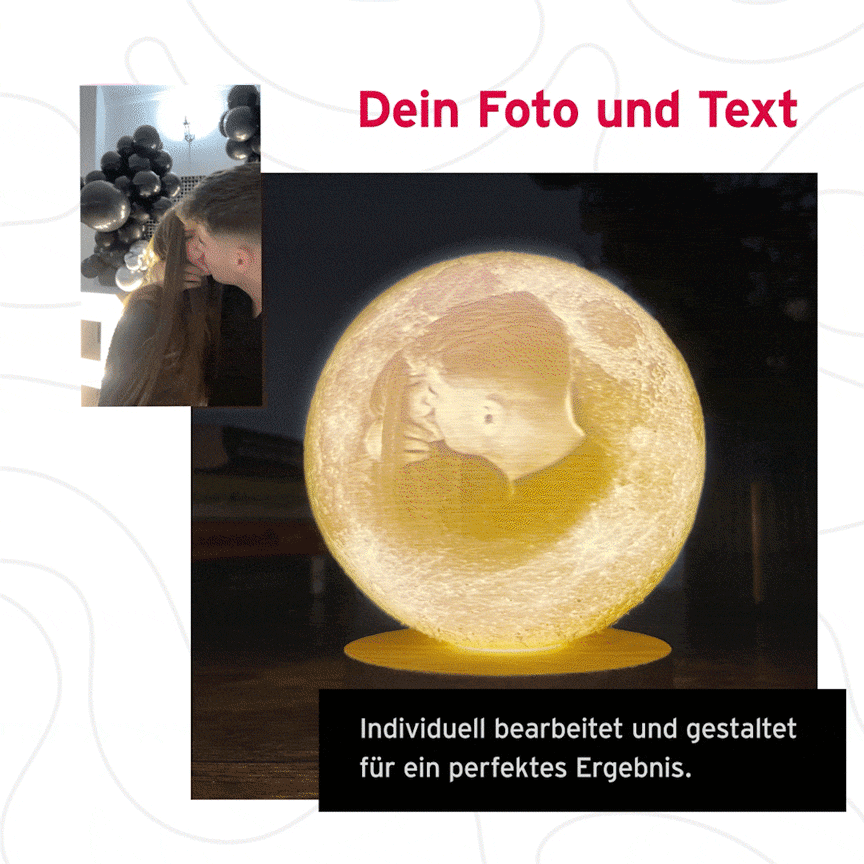 Wir bearbeiten Ihre Fotos für eine perfekte Lichtwiedergabe und platzieren sie harmonisch auf der Mondoberfläche – ohne sichtbare Kanten. Vor dem Druck erhalten Sie ein Vorschau-Video, das Ihnen die Lampe aus allen Perspektiven zeigt.
